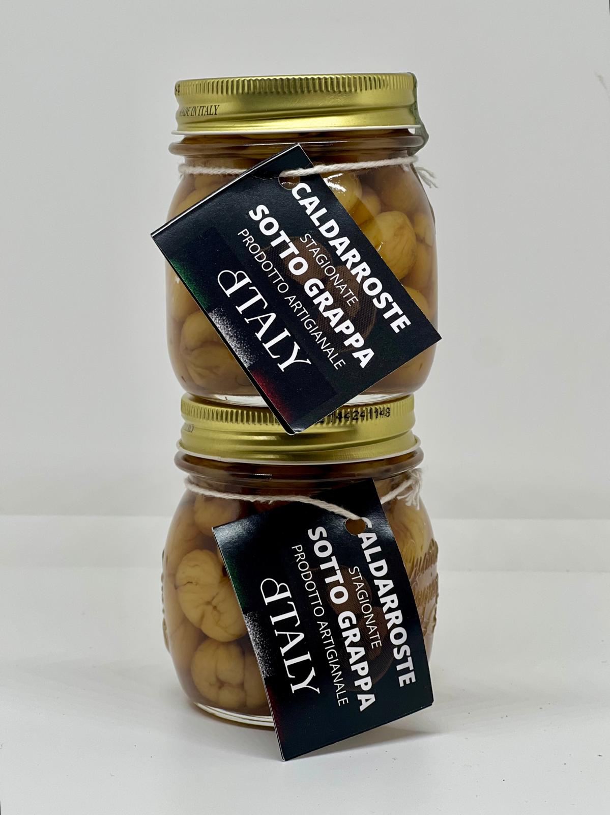 La cottura che è la prima alchimia di questo prodotto viene svolta esclusivamente sul fuoco a legna che crea colorazioni e scottature uniche e ineguagliabili donando anche un gusto inimitabile; sbucciate a mano una a una e posate negli appositi vasetti in vetro incontrano una particolare Grappa selezionata nel paese di Asti.