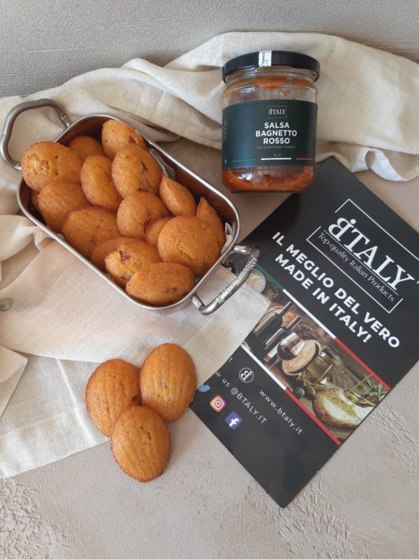 Le madeleine salate sono realizzate con la salsa al bagnetto rosso di Btaly, del parmigiano grattugiato e della pancetta.